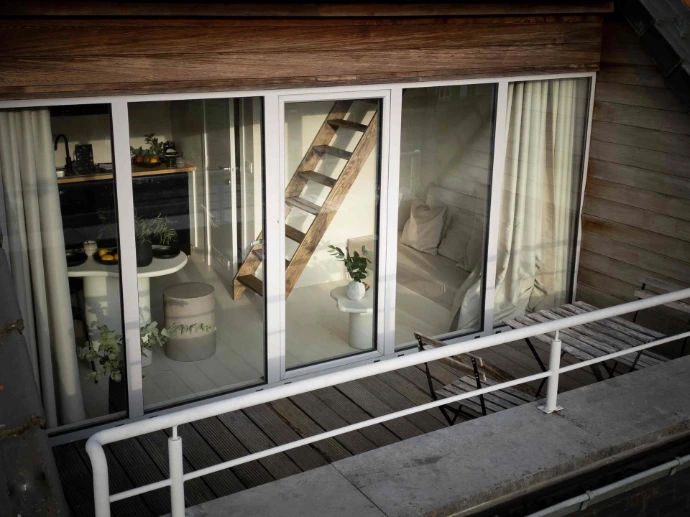 m² hebben een eigen terras en een trap naar de mezzanine verdieping, met een tweepersoonsbed (160 cm) en een kast met kleerhangers. Er is een zithoek met een bank/sofa en een salontafel. De badkamer heeft een wastafel, een douche en een toilet. De duplex studio's hebben een kleine keuken met de nodige basisvoorzieningen en een eethoek. Max: 3 personen